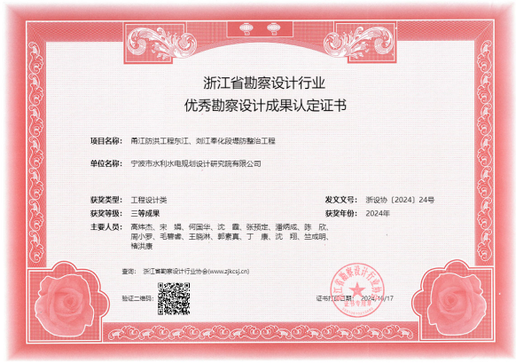 在工程項(xiàng)目方面,獲得2022年度全國(guó)優(yōu)秀工程咨詢(xún)成果獎(jiǎng)、2024年度寧波市優(yōu)秀勘察設(shè)計(jì)獎(jiǎng)、2024年浙江省勘察設(shè)計(jì)行業(yè)優(yōu)秀勘察設(shè)計(jì)”綜合類(lèi)成果獎(jiǎng)、寧波市優(yōu)秀水利工程設(shè)計(jì)二等獎(jiǎng)、“浙江省文明標(biāo)化工地”稱(chēng)號(hào)、“2024年度寧波軌道交通市域鐵路工程立功競(jìng)賽先進(jìn)集體”等各類(lèi)獎(jiǎng)項(xiàng)十余項(xiàng)。