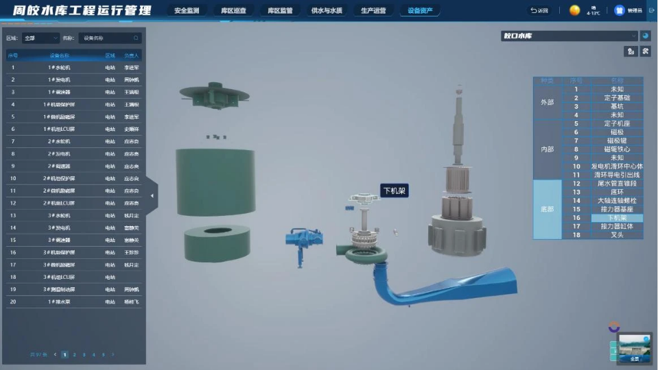 依托BIM仿真建模技術(shù),數(shù)字孿生周公宅-皎口梯級水庫系統(tǒng)實現(xiàn)了對水庫重要設(shè)備資產(chǎn)的精細(xì)管理。結(jié)合監(jiān)測監(jiān)控數(shù)據(jù),實時掌握水庫防洪、供水、發(fā)電的運行狀況,保障水庫安全高效運行。同時,利用BIM技術(shù)對水輪機(jī)、發(fā)電機(jī)等重要機(jī)電設(shè)備進(jìn)行零部件級的拆解,“再現(xiàn)”設(shè)備的內(nèi)部機(jī)構(gòu)和狀態(tài)。這一技術(shù)幫助水庫工作人員直觀、深入地了解設(shè)備的運行原理與機(jī)制,為設(shè)備的精細(xì)管理及維修養(yǎng)護(hù)提供重要支持,也大幅提升了水庫設(shè)備管理的智能化水平。