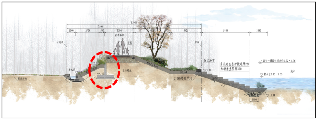 為了保證水體交換同時(shí)防御土體掏刷,工程迎水側(cè)護(hù)坡采用多孔混凝土生態(tài)護(hù)坡磚,不僅防沖固土,也利于水生動(dòng)植物生長,營造自然、生態(tài)的水岸環(huán)境。