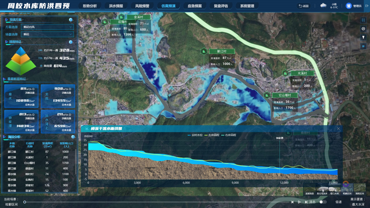 入庫1800多場(chǎng)歷史臺(tái)風(fēng)信息,通過臺(tái)風(fēng)路徑相似度匹配,獲取歷史臺(tái)風(fēng)周公宅水庫、皎口水庫庫區(qū)降雨網(wǎng)格化數(shù)據(jù),為預(yù)報(bào)和調(diào)度決策提供參考。建設(shè)鄞江流域產(chǎn)匯流模型、梯級(jí)水庫聯(lián)合調(diào)度模型和水庫下游一二維耦合水動(dòng)力模型,通過水庫調(diào)度對(duì)下游防洪影響的正向預(yù)演,以及對(duì)上游庫區(qū)淹沒和大壩自身安全的逆向推演,動(dòng)態(tài)推薦多目標(biāo)優(yōu)化調(diào)度方案,有力支撐水庫從前期預(yù)泄、中期錯(cuò)峰到后期攔蓄的全過程調(diào)度決策。將傳統(tǒng)的各水庫獨(dú)立預(yù)報(bào)的流程進(jìn)行重塑,實(shí)現(xiàn)兩座水庫工作人員在同一平臺(tái)上協(xié)同操作、實(shí)時(shí)計(jì)算與快速分析,聯(lián)合預(yù)報(bào)調(diào)度方案的制定時(shí)間從原先的10分鐘縮減至目前的1—2分鐘,顯著提升了洪水預(yù)報(bào)效率。同時(shí),周公宅水庫、皎口水庫高精度的洪水預(yù)報(bào),為寧波市甬江流域一體化調(diào)度提供較為精確的上邊界條件,提高了下游平原河網(wǎng)的洪水預(yù)報(bào)精度,在近年的流域防洪中發(fā)揮了很好的實(shí)戰(zhàn)作用。