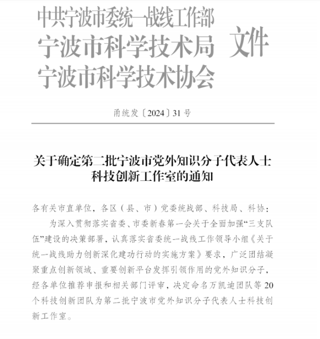 近日,寧波市統一戰(zhàn)線助力創(chuàng)新深化建功行動啟動儀式在寧波院士中心舉行。啟動儀式上,市委常委、統戰(zhàn)部部長林雅蓮為第二批寧波市黨外知識分子科技創(chuàng)新工作室團隊授牌。寧波市黨外知識分子科技創(chuàng)新工作室由市委統戰(zhàn)部會同市科技局、寧波市科協認定。我院張預定創(chuàng)新工作室位列其中。